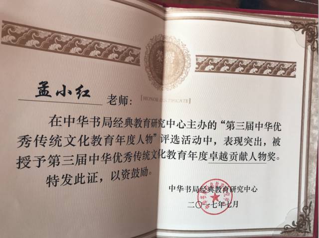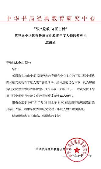 2017年7月31日,在云南省迪庆州青少年活动中心由中华书局主办的第三届中华优秀传统文化教育年度人物颁奖典礼上,孟小红女士荣获《卓越贡献人物奖》。