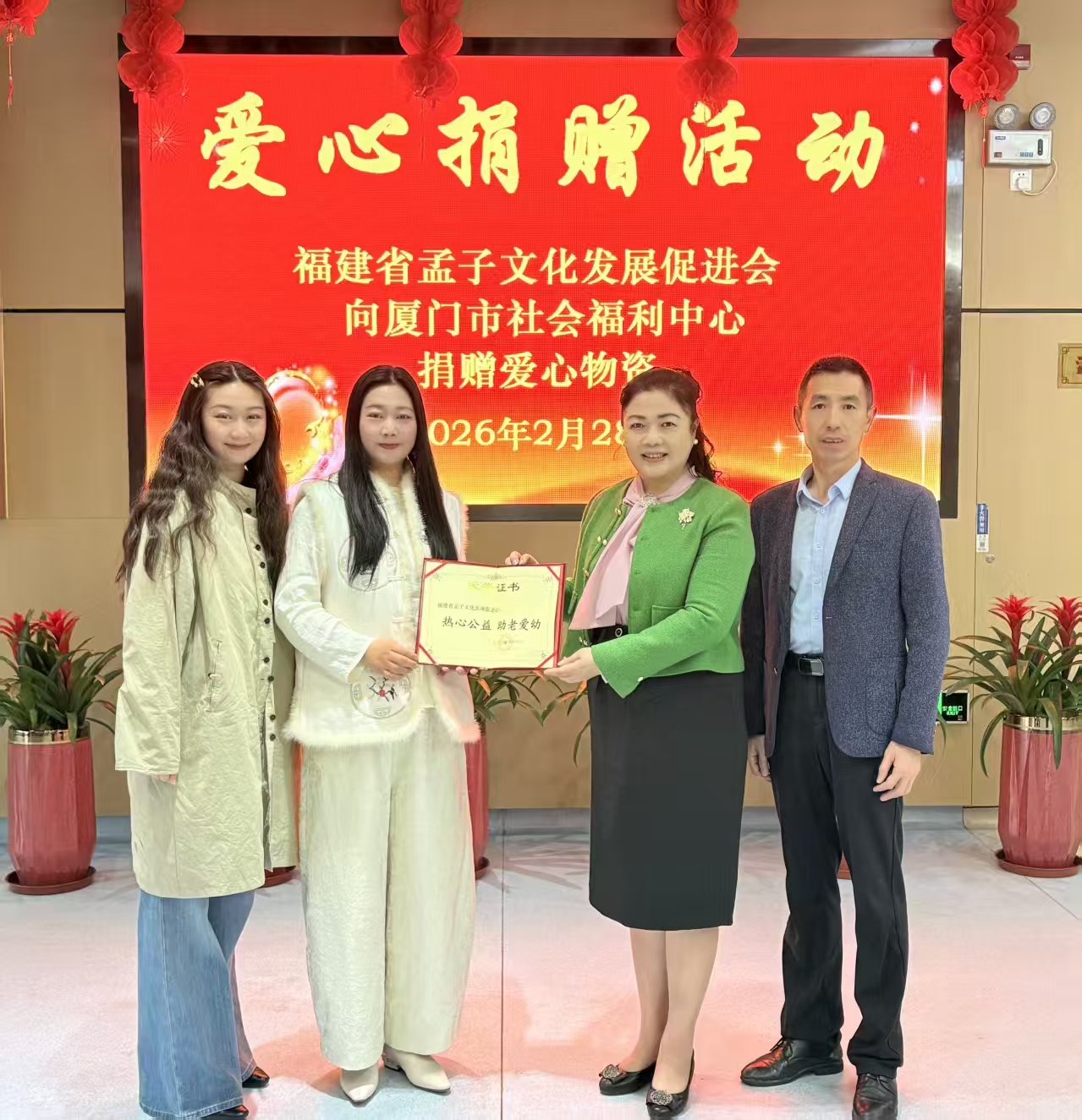 期间,福建省人大社会建设委员、厦门市社会福利中心副主任韩韬轶代表中心向福建省孟子文化发展促进会会长孟小红颁发《荣誉证书》,对促进会“热心公益,助老爱幼”的爱心善举予以表彰。孟小红会长表示:“孟子曰:‘老吾老以及人之老,幼吾幼以及人之幼。’感谢在潘老师的带领下,让我们有机会为厦门市社会福利中心的老人和儿童尽一份绵薄之力,心怀感恩。”